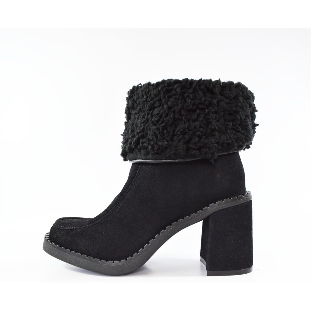 Bota em camurça. Bico levemente quadrado com costura acomapanhando o desenho. Detalhe de pelo na mesma cor na bota, na gola. Sato 8cm.