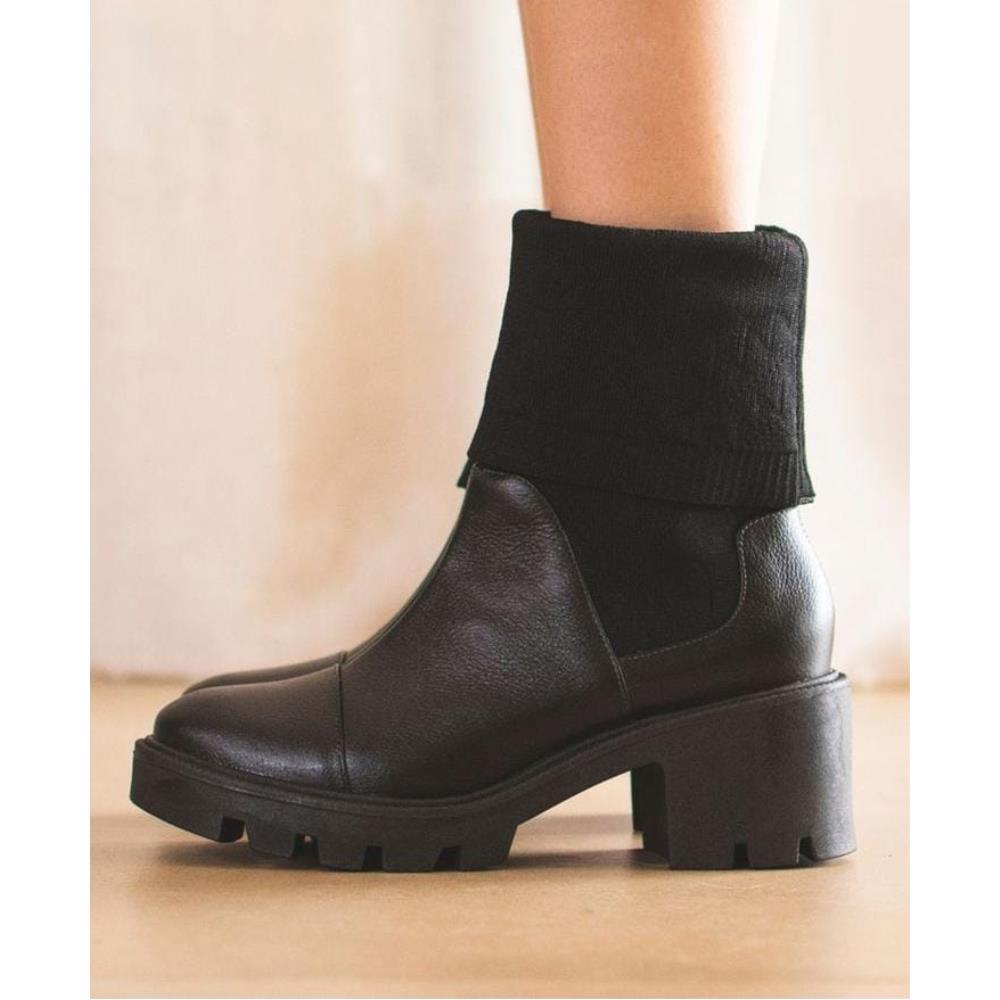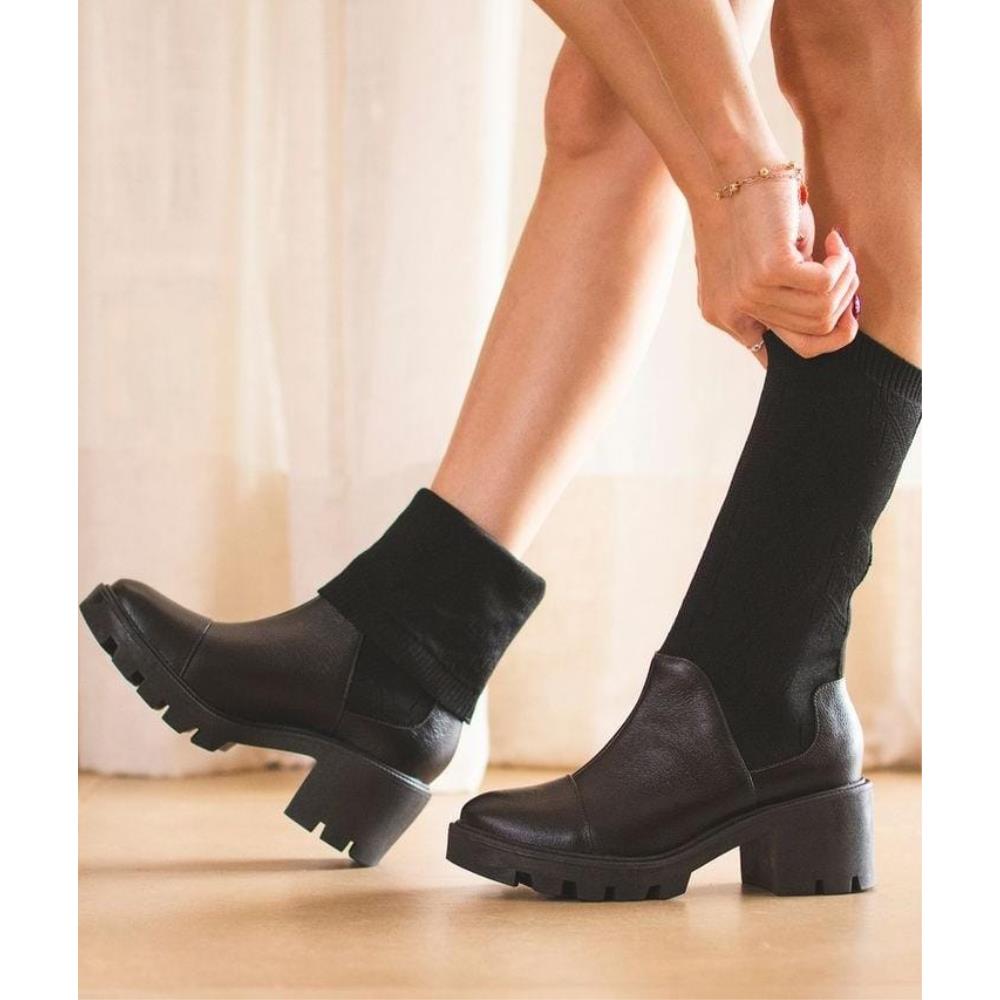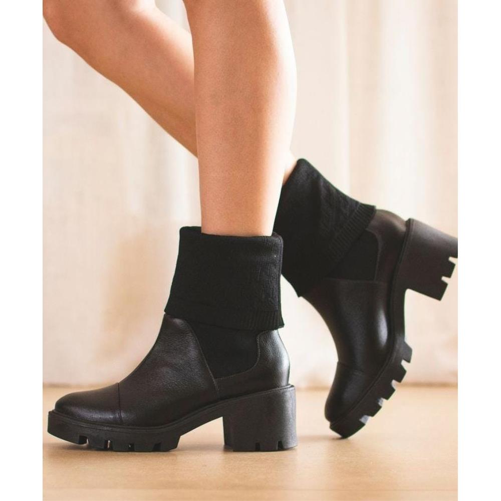 Bota em couro e solado tratorado, salto 7cm. Parte superior em tecido com lycra na perna. A parte em tecido pode ser ajustável para ficar mais curtaou comprida. Um modelo em vários!