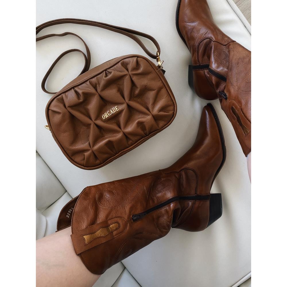 Bota western ou texana em couro de cabra. Salto 6cm. Modelo super tendência com bordados super delicados e couro extremamente macio. Cor: Marrom caramelo