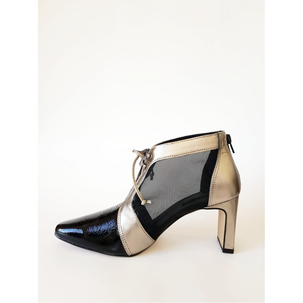 Ankle Boot em couro legítimo, com parte em tela e parte em verniz preto. Detalhes em couro grafitti.Salto 7cm Um calçado que marca presença!