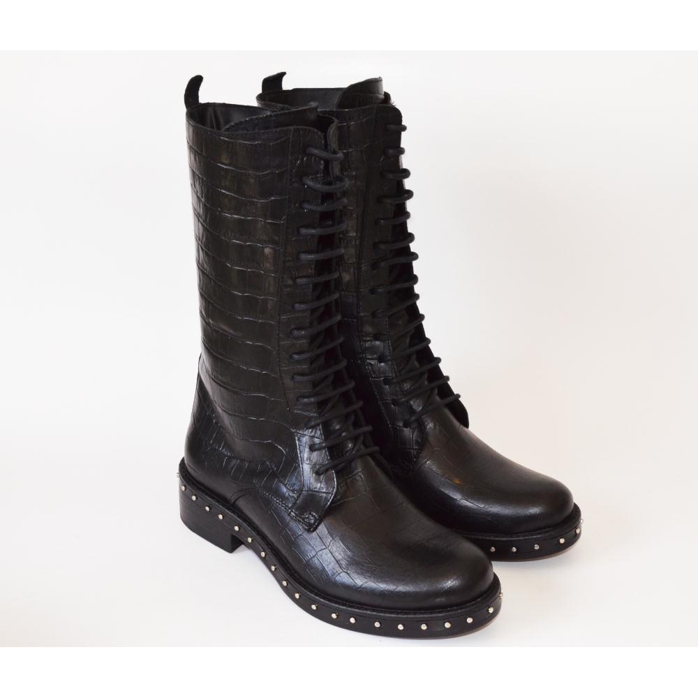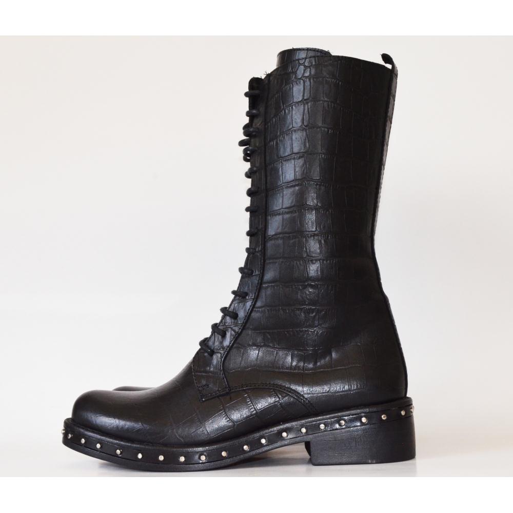 Coturno em couro texturizado, com pequenas tachinhas no solado. Cano médio. Com cadraço.Salto 2cm.