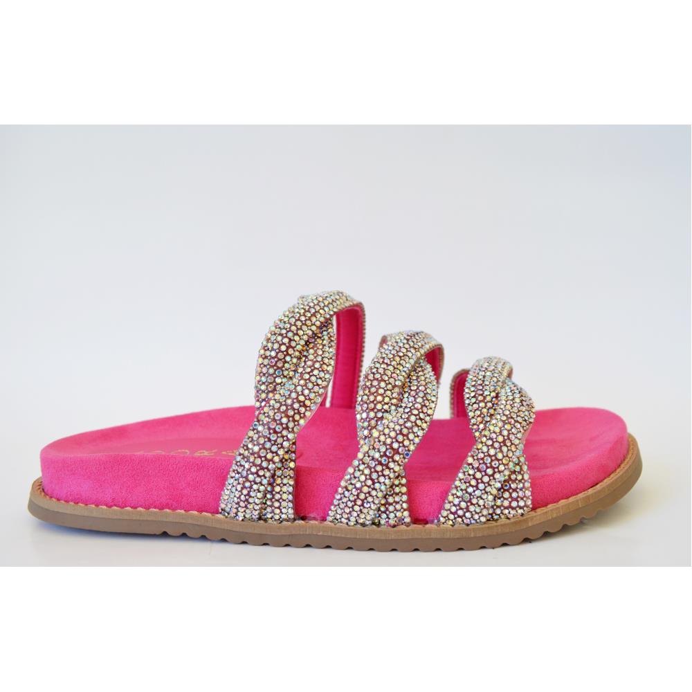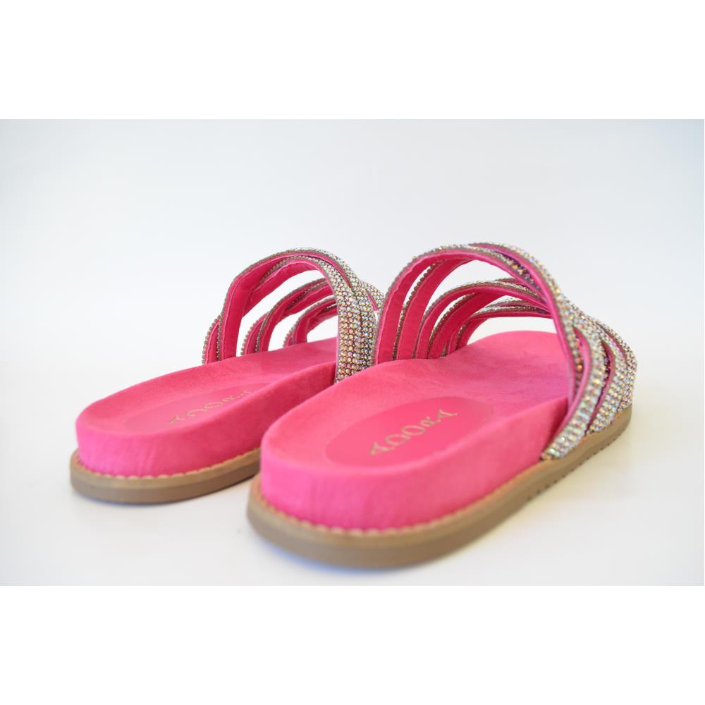 Birken com solado rosa fucsia e tiras entrelaçadas em pedras furtacor com a aplicação perfeita. Simplesmente maravilhosa!