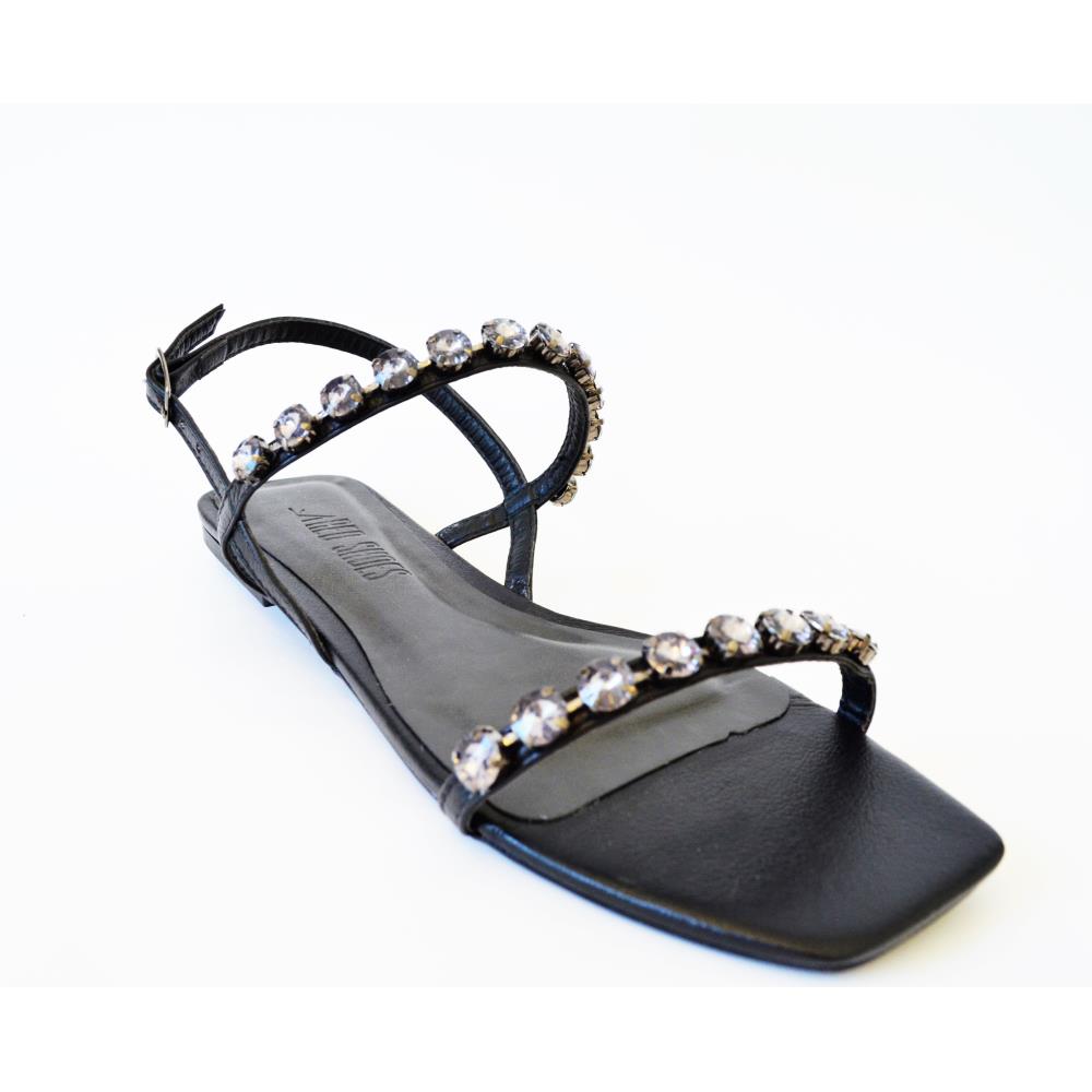 Sandália flatcom duas tiras com aplicaçoes de pedras fume escuras. Material: Couro. Cor preta. Delicada, elegante e confortável!