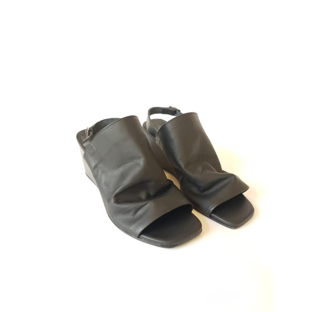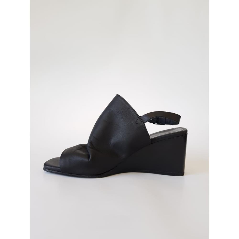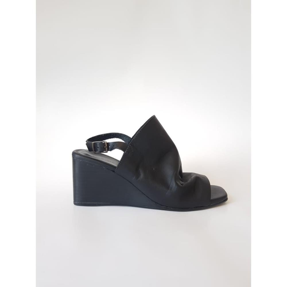 Sandália  em couro pelica de cabra, anabela slip-on com salto em PU encapado com fachete de couro, super leve e cabedal em couro soft muito macio. Altura do salto 6 cm . Cor Preta.