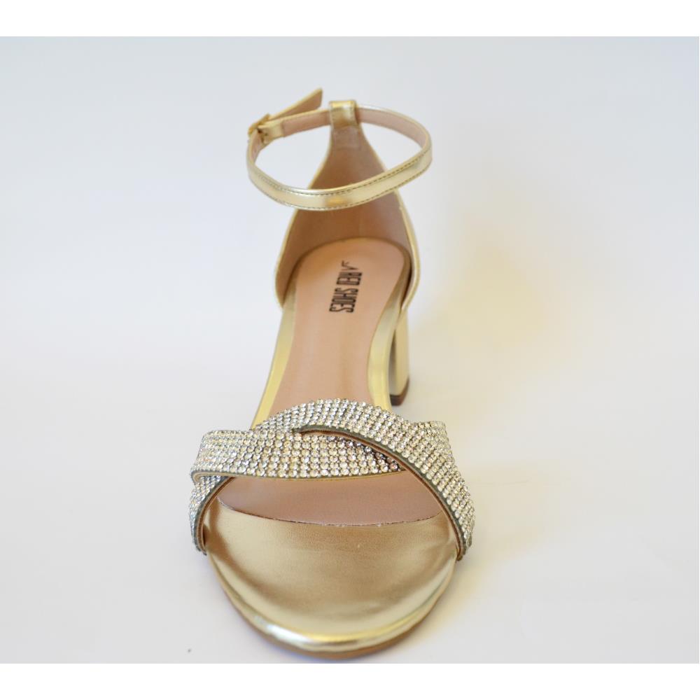 Sandália em couro, dourada. Salto bloco 7cm. Duas tiras em delicadas aplicações de strass em dourado.