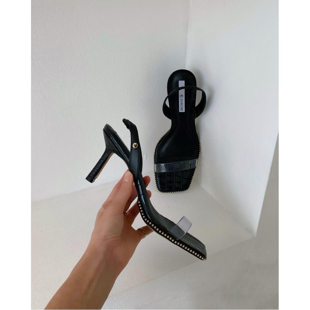 Sandália delicada e cheia de estilo. Salto fino 6cm, croco. Aplicaçãode pequenas tachinhas no solado. Cor Preta.
