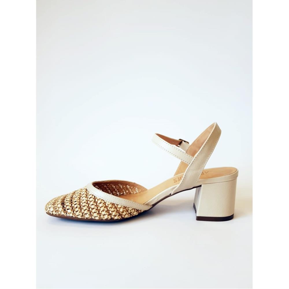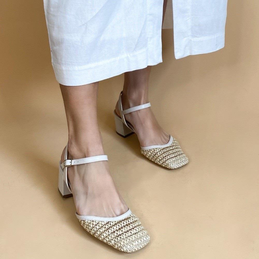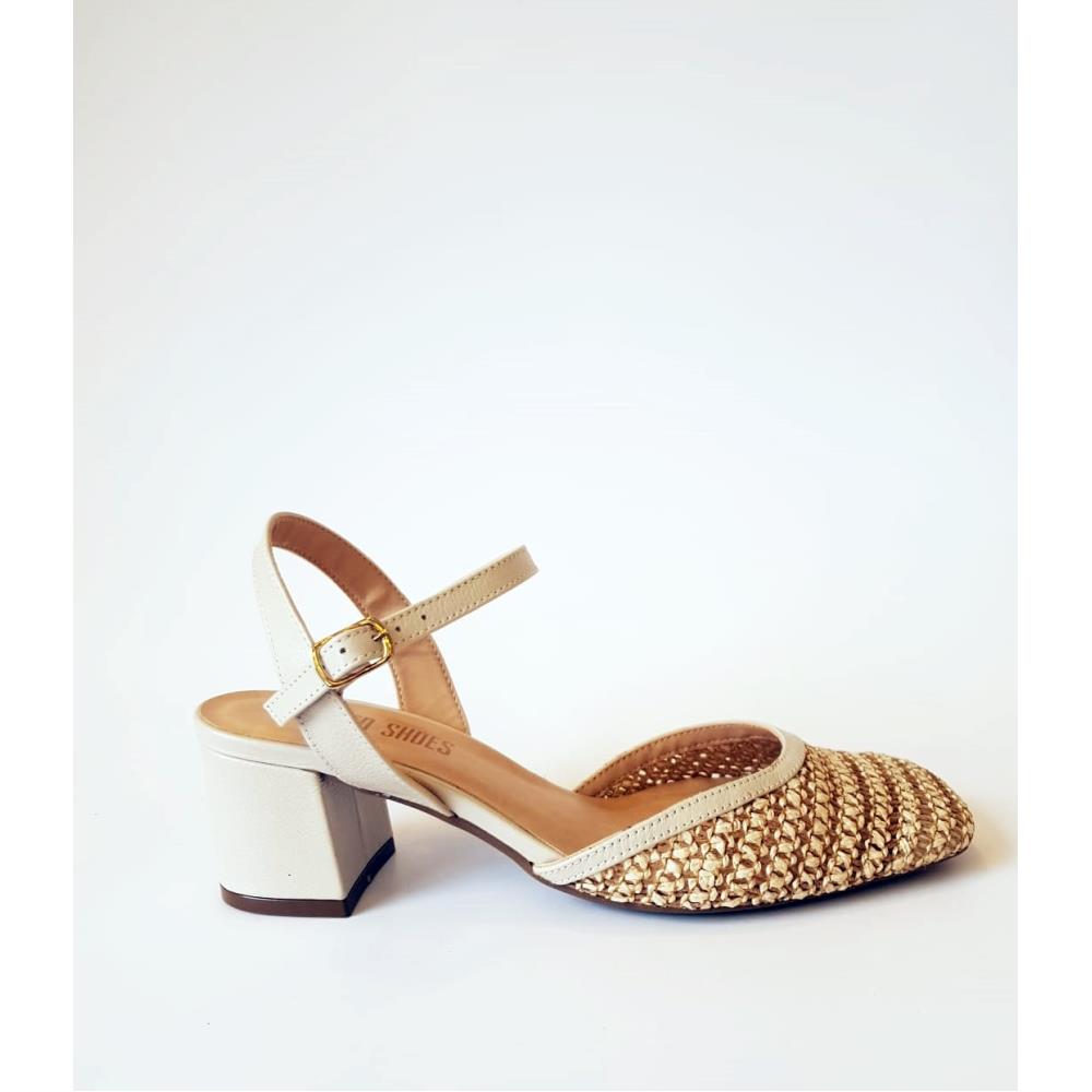 Sapato estilo chanel, aberto no calcanhar. Feito em trama imitando palha e couro legítimo. Possui salto médio com 6cm, fivela para ajuste, bico quadrado e solado em borracha.Marca Red Shoes.