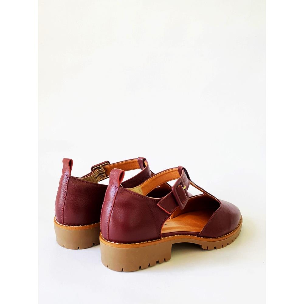 Sapato 100% em couro com solado tratorado 3cm e fechamento com fivela. Cor Marsala