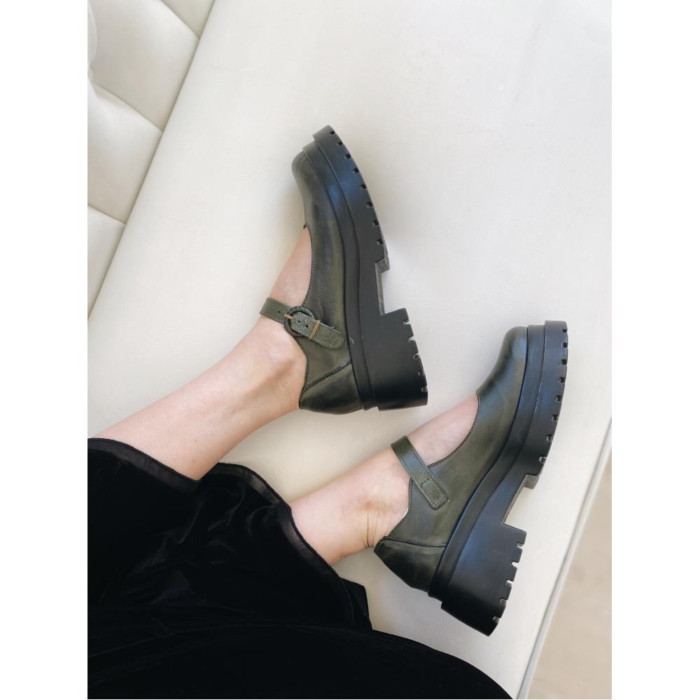 Versão atualizada do sapato boneca, em couro na cor verde escuro com solado de borracha resistente e tratorado, com salto 7cm.