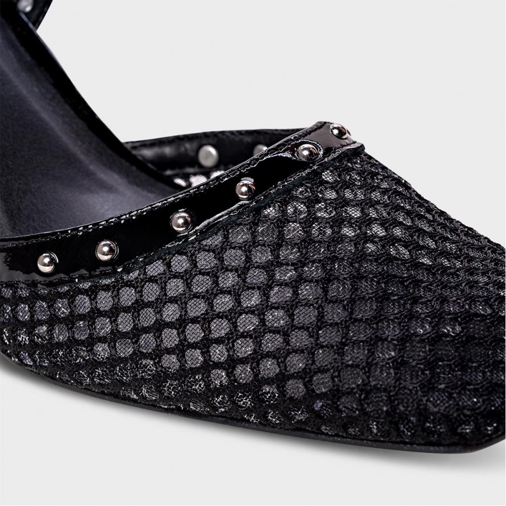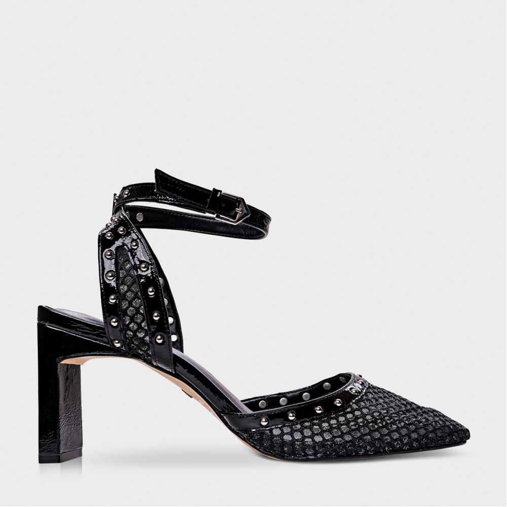 Scarpin em tela e couro verniz estilo boneca. Aplicações em studs que envolve o desenho do modelo. Possui salto reto e bico quadrado. Deixa o calcanhar à mostra e fechamento fivela ajustável no tornozelo. Com palmilha da cor do modelo, possui também o ícone e a inscrição do nome da marca. FEITO EM COURO LEGÍTIMO.