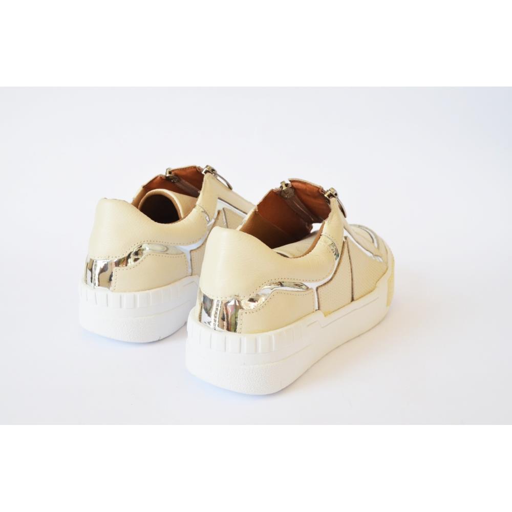 Tênis em couro com aplicações em prata, dois zíperes na parte frontal lateral. Seu solado na proposta caixa tem altura de 2,5 e acompanha uma biqueira personalizada combinando com o cabedal. É uma proposta comfy e utilitária para acompanhar seus looks. Cor: Off White