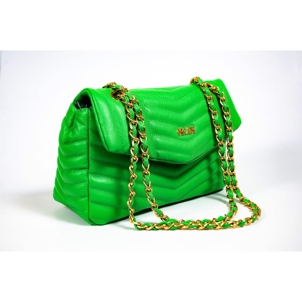 A bolsa é toda em couro com estampa em matelassê. Seu fechamento é em zíper magnético e traz alça de corrente metalizada com possibilidade de regulagem. Tem altura de 18cm, 27cm de largura e 15cm de profundidade. Cor: Verde