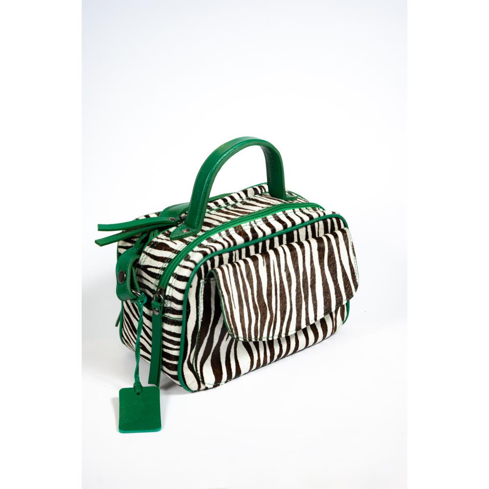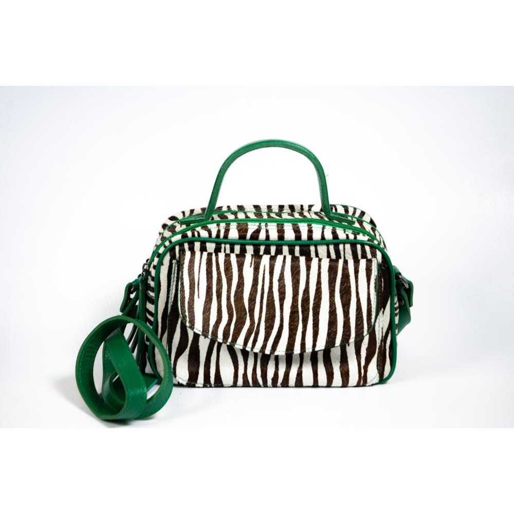 Bolsa em tamanho médio, com dois compartimentos com zíper e grande espaço interno. Possui bolsos internos, alça curta em couro e alça comprida ajustável e removível também em couro. Estampa de zebra em camurça. Maravilhosa!