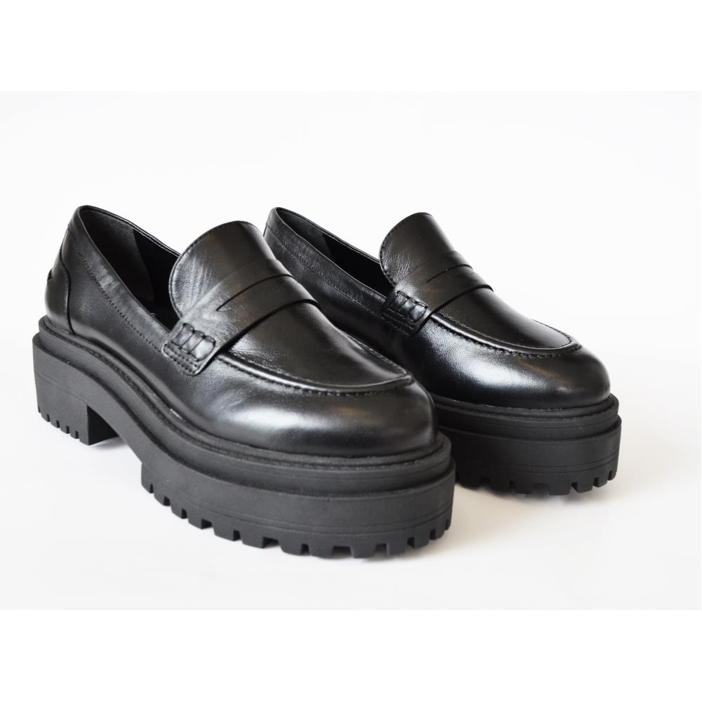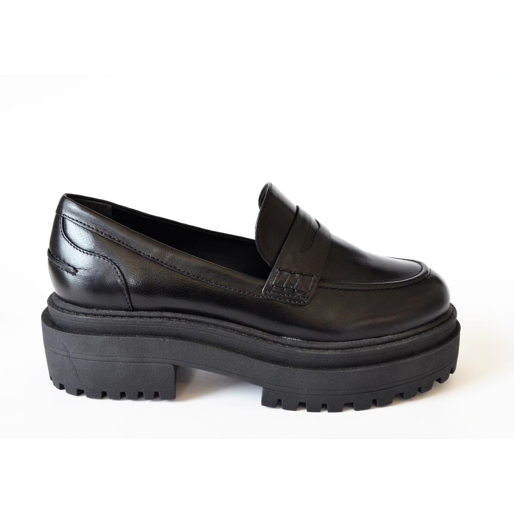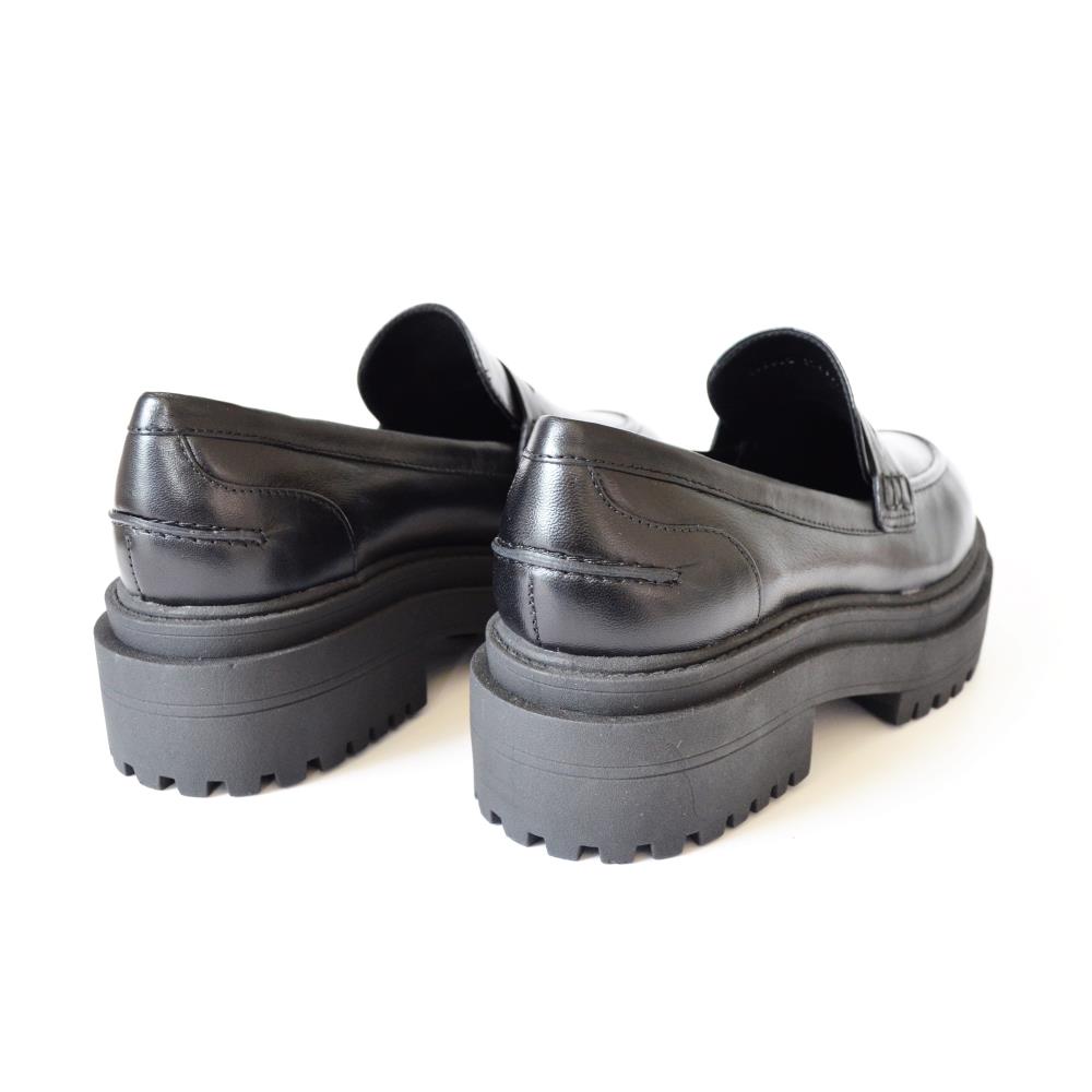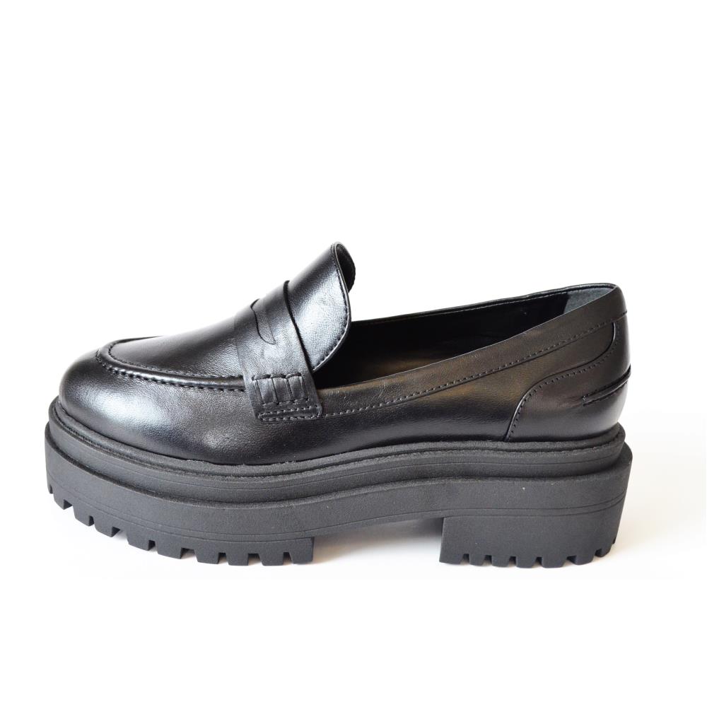 Mocassim solado alto 5cm, tratorado em couro de cabra. Cor Preta.