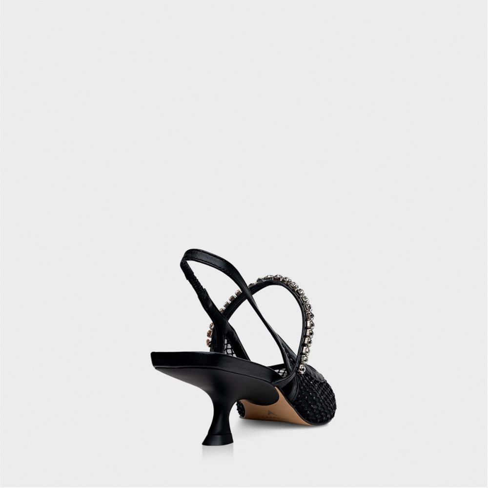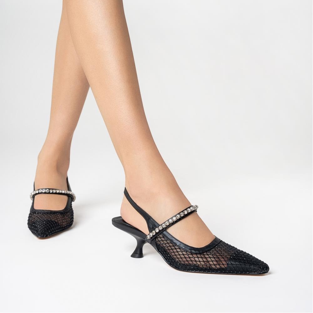 Scarpin slingback em tela com aplicações de cristais. O modelo tem salto kitten heel levemente curvado e bico fino. Possui tira fina com pedrarias brilhosas no peito do pé. Tiras de couro contornando o modelo e fechamento com elástico na parte traseira, deixando o calcanhar à mostra. O elástico serve para facilitar o calce. Com palmilha da cor do modelo. Salto geométrico 5cm.